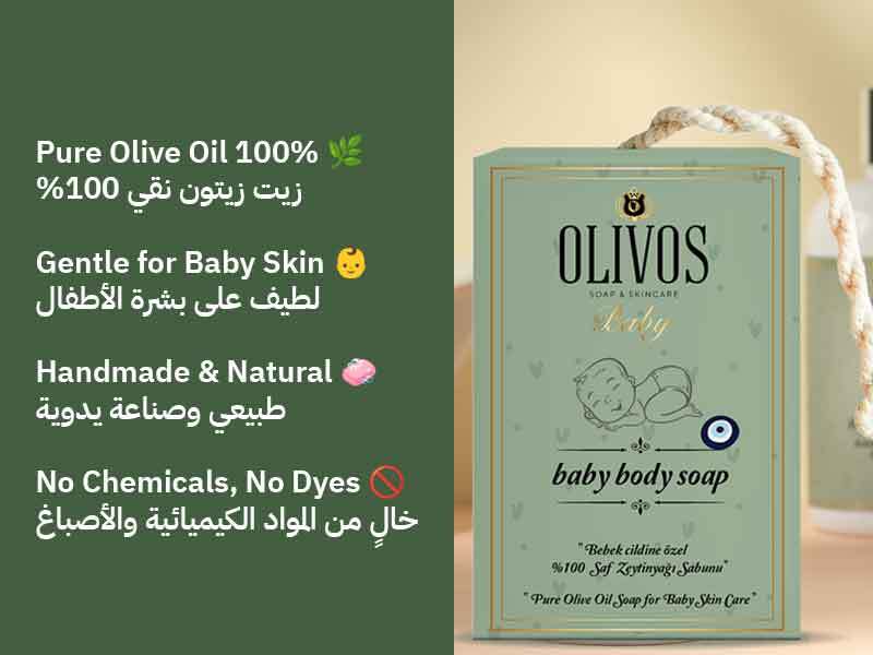 A handcrafted soap made with 100% pure extra virgin olive oil using traditional methods, specially designed for delicate baby skin. It cleanses gently without irritation while maintaining the natural pH balance of the skin. Free from alcohol, dyes, harsh chemicals, and animal fats, making it safe for daily use. With a soothing natural aroma and moisturizing properties, it helps calm babies and prepare them for a peaceful sleep. Comes with a practical hanging rope for convenient use. Dermatologically tested for sensitive skin.