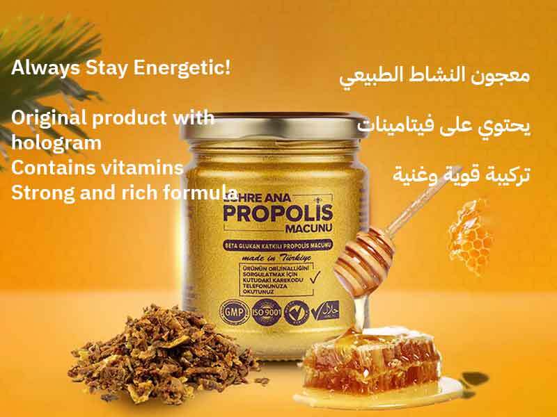 يحتوي على البروبوليس، غذاء الملكات، حبوب اللقاح، الجينسنغ الكوري، المستكة، ودبس الخروب، ليساعد على دعم النشاط والحيوية والتوازن اليومي. يمنحك كل ملعقة مزيجاً من المذاق الطبيعي والطاقة المستخلصة من أنقى المكونات الطبيعية.